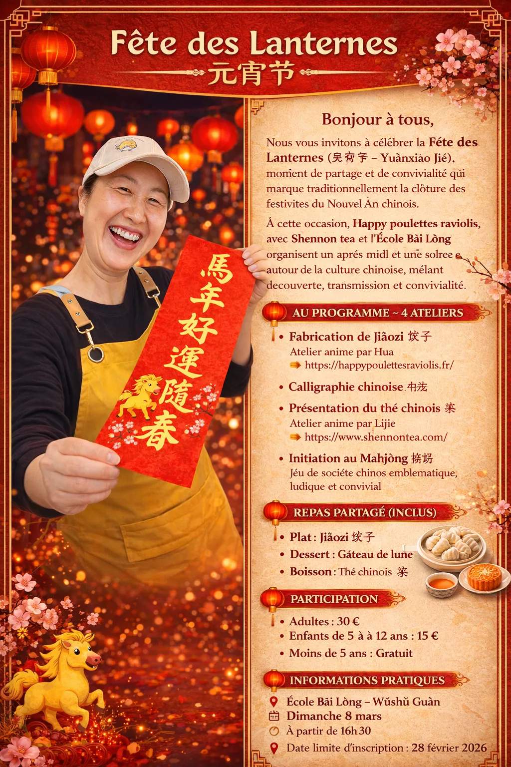 À cette occasion, Happy Poulettes Raviolis, avec Shennon Tea et l’École Bái Lóng organisent un après-midi et une soirée autour de la culture chinoise, mêlant découverte, transmission et convivialité.