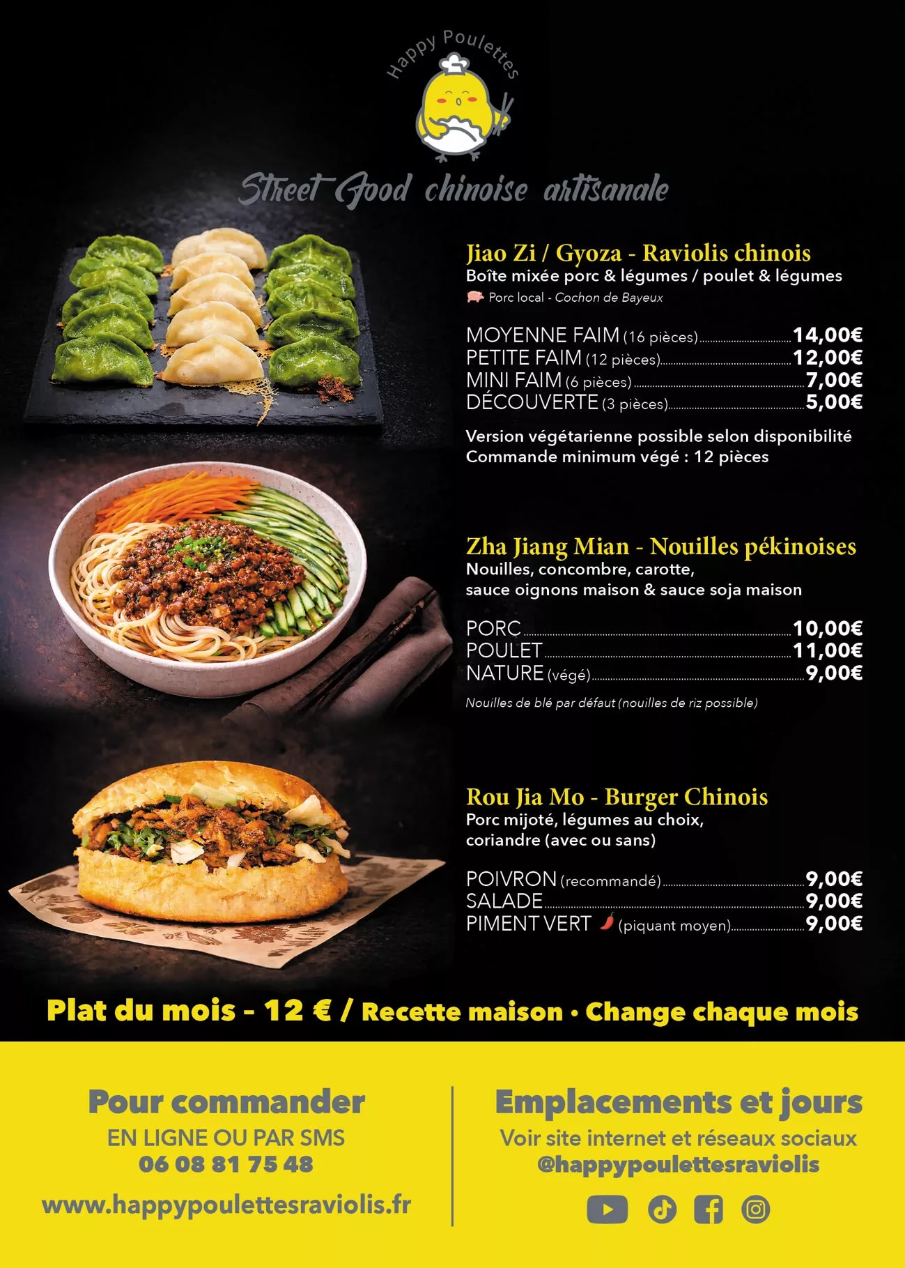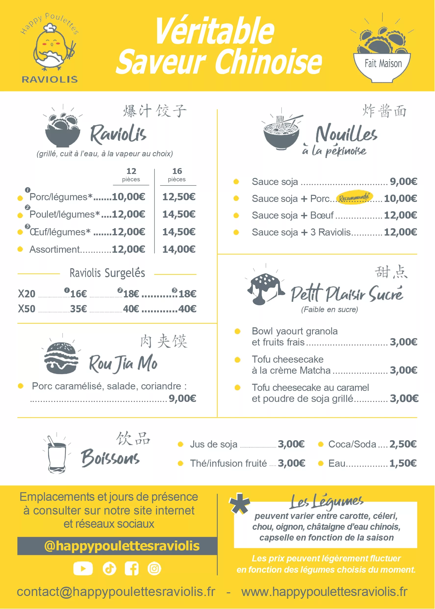 Note importante : Le menu affiché sur notre food truck et nos réseaux sociaux présente la liste complète de toutes nos spécialités. Cependant, tous les plats ne seront pas disponibles en même temps. Nous mettons à jour le menu du moment régulièrement pour vous garantir le vrai fait maison.